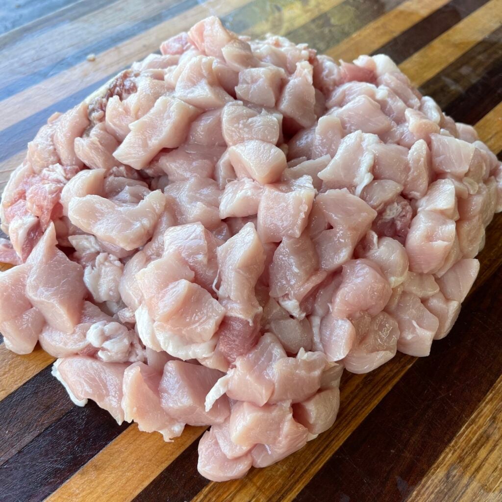 - Cube up the pork loin into bite size pieces