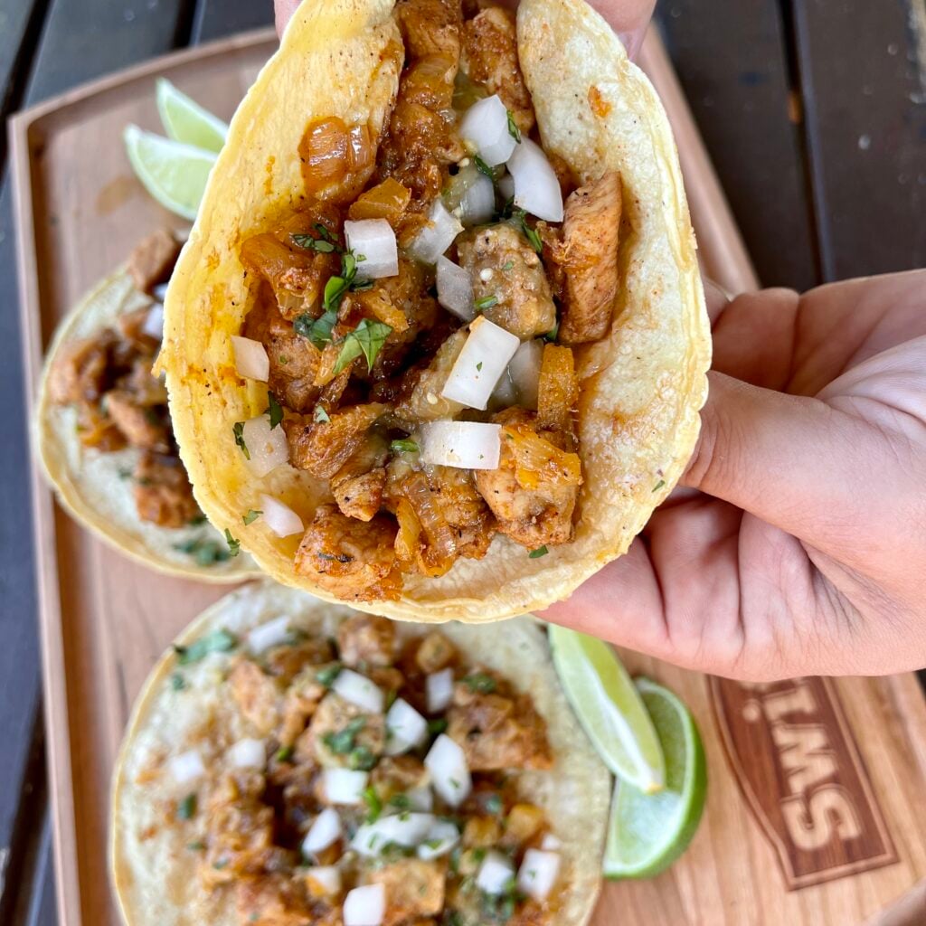 Looking for a quick and delicious taco dinner? These easy pork tacos only took a few minutes to make and were filled with delicious savory and sweet flavors similar to an Al Pastor. The mix of pork with onion and pineapple is a great weeknight dinner treat or lunch left overs. I used my griddle but you can use any grill or a stove top for this recipe.
