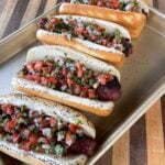 Keyword: bacon wrapped hotdog, hotdog recipe, pico de gallo recipe, homemade pico de gallo, bacon wrapped sausage, dinner recipes, grilling recipes, grillin with dad recipes, grilling with dad recipes.