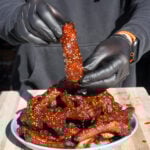 Keyword: chili crunch party ribs, baby back ribs, smoked ribs, bbq sauce, smoker, tailgating recipe, game day recipe, grillin with dad recipes., sticky, spicy, smoked, party food