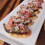 Take a french loaf, slice into small pieces, toast on the grill. Start with a layer of garlic butter, add a slice of the steak and add a tablespoon of the tomato bruschetta. Spread some parmesan over the top and serve.