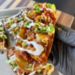 For the final touch, drizzle some BBQ sauce of choice, some crema or sour cream and chopped up green onion